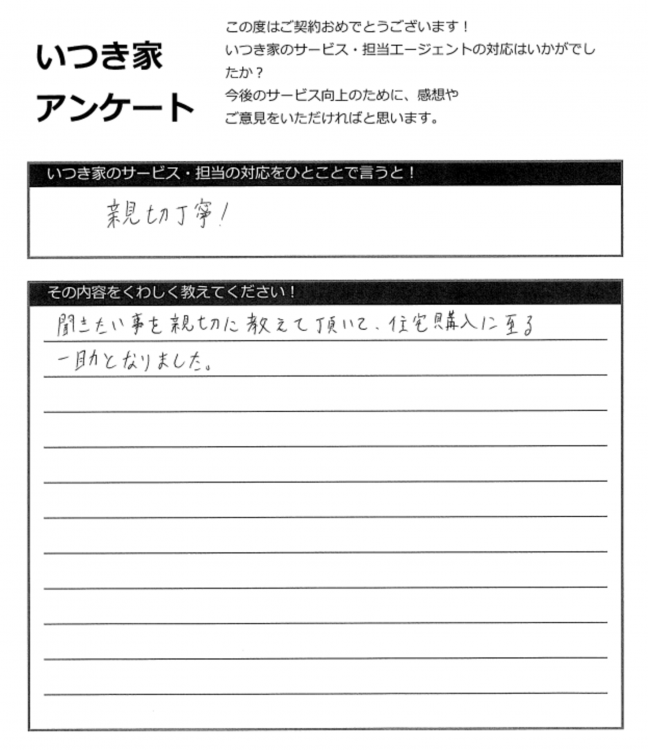聞きたい事を親切に教えて頂いて、住宅購入に至る一助となりました。
