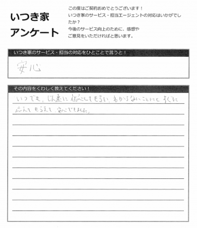 いつでも迅速に対応してもらい、わからないことにもすぐに応えてもらえて安心できました。