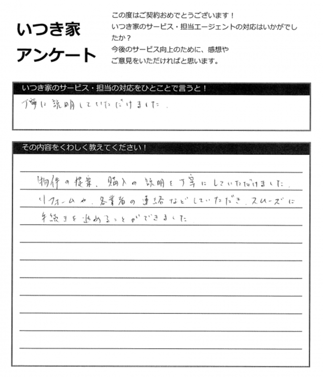 物件の提案、購入の説明を丁寧にしていただけました。
